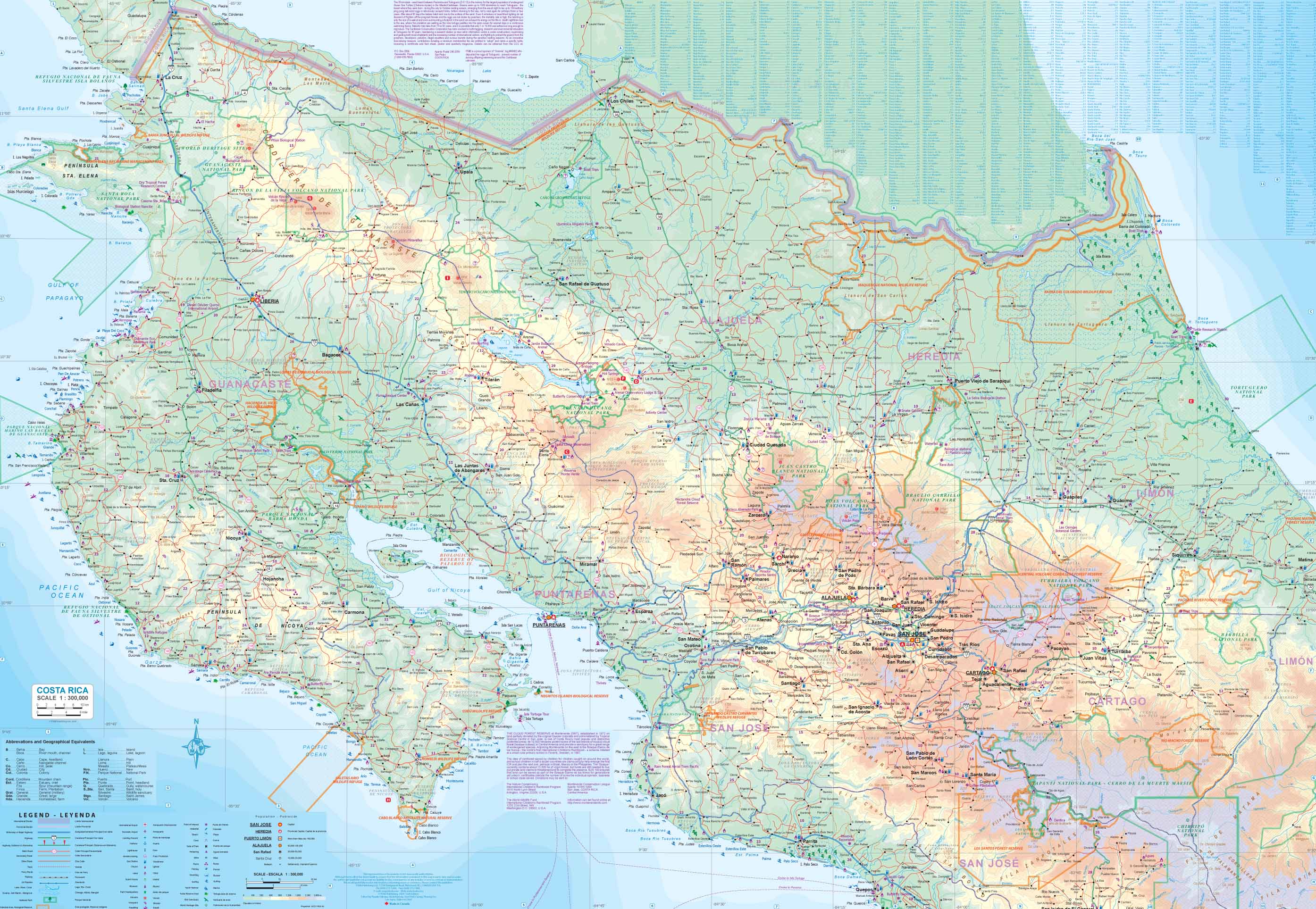 Clearly marked roads, national parks, conservation areas, and major cities including San José, Liberia, and Puerto Limón. -