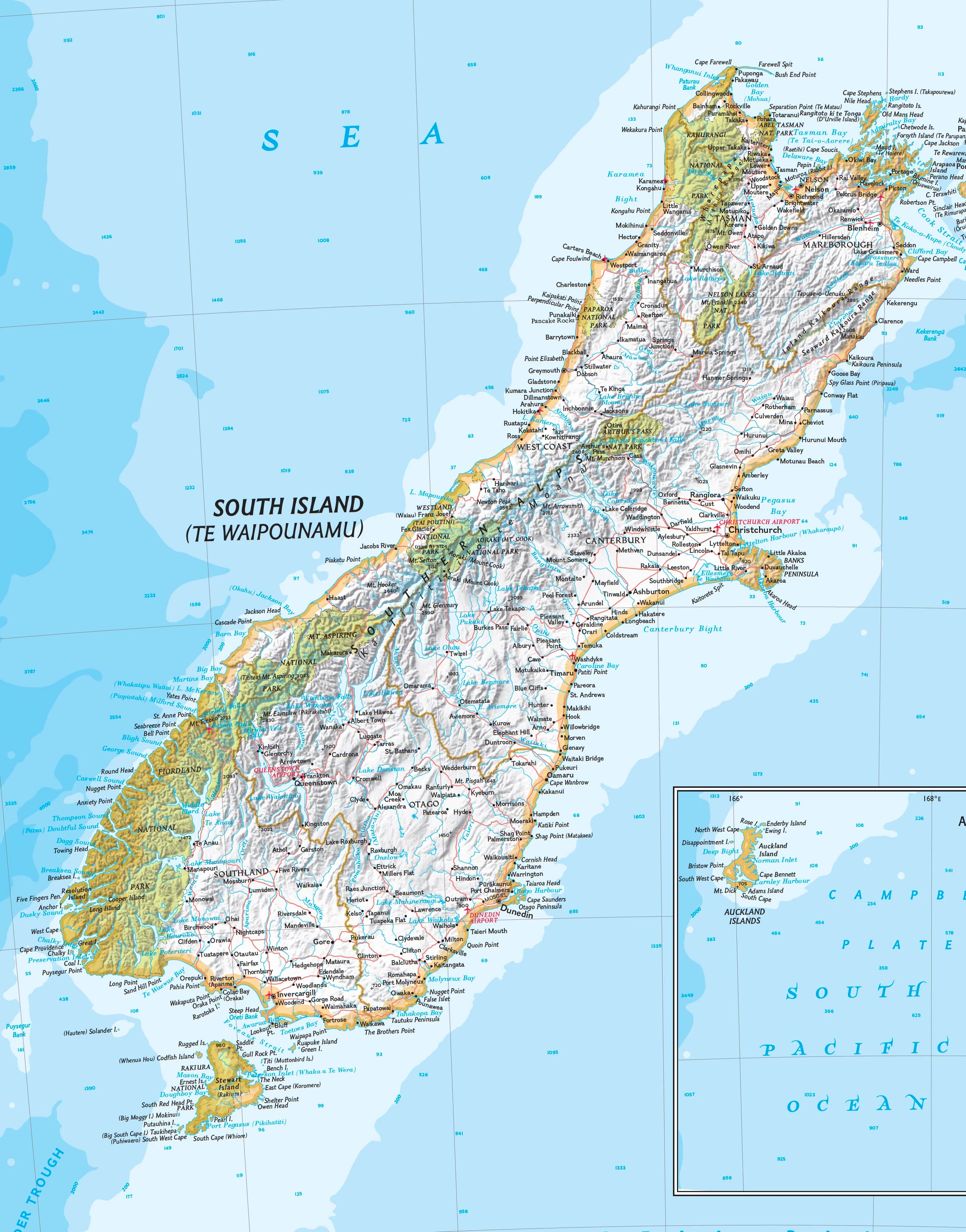From the subtropical coastlines of the North Island (Te Ika-a-Māui) to the rugged, glacial-carved fjords of the South Island (Te Waipounamu), this map captures the geographical diversity of New Zealand with exceptional clarity.