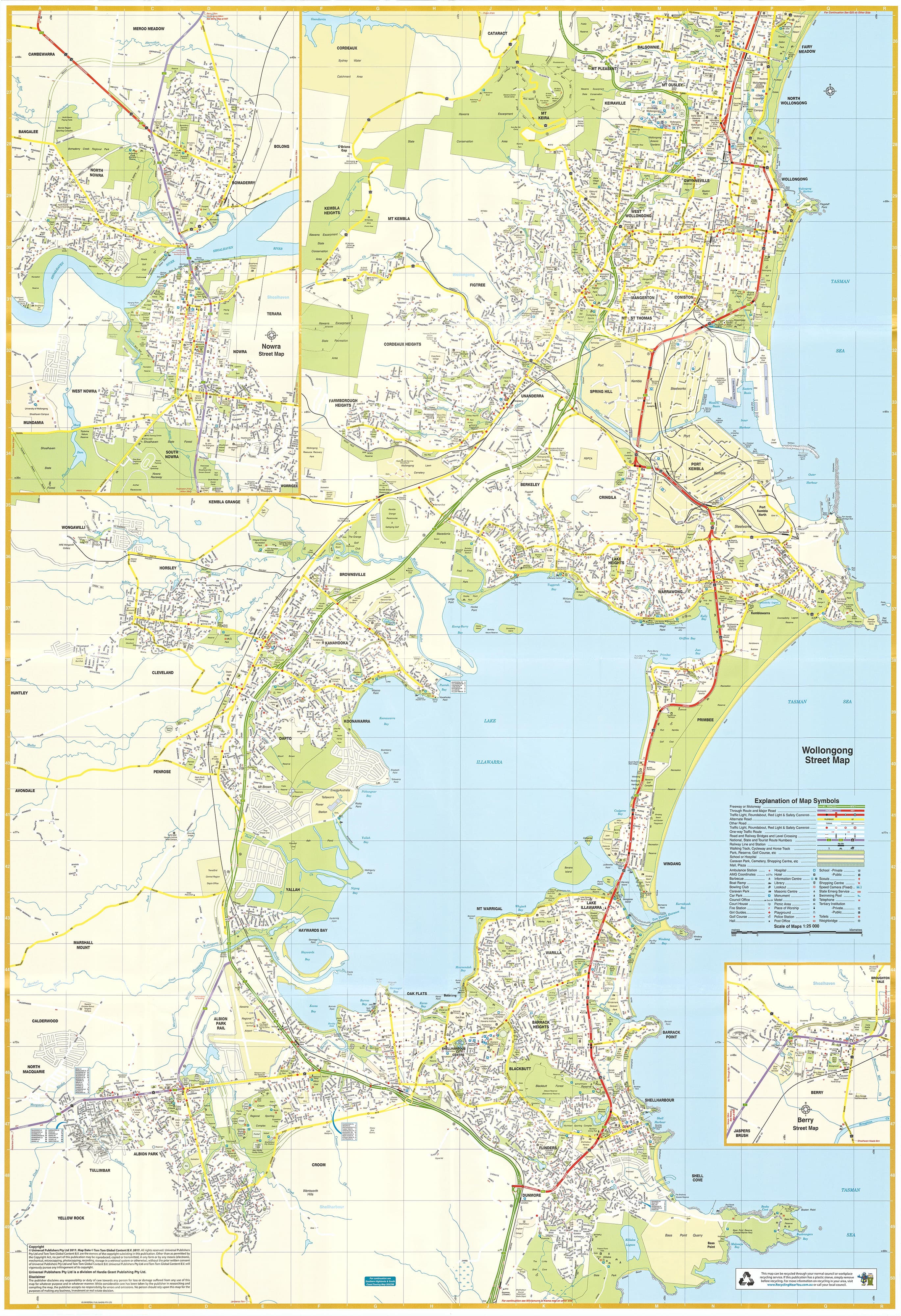 This highly detailed street-level map provides a clear view of Wollongong and surrounding suburbs, stretching north to Helensburgh and south to Kiama, and includes additional detailed town maps of Nowra and Berry — two of the South Coast’s most popular and picturesque communities.